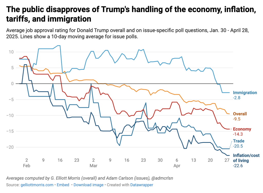 - This is from about a week ago, from G. Elliot Morris, but I never got around to sharing it. It is striking that Trump is underwater in every major category, including immigration (which suggests that pointing out the evils of sending Kilmar Abrego Garcia to CECOT wasn’t a waste of time). The economy, trade, and cost of living numbers are pretty devastating, given that his whole shtick was that he was the economy president.