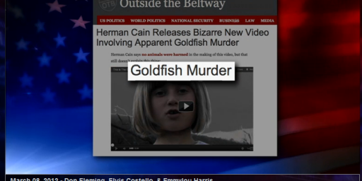 Doug Mataconis’ Thursday posting “Herman Cain Releases Bizarre New Video Involving Apparent Goldfish Murder” got picked up on that night’s edition of The Colbert Report.