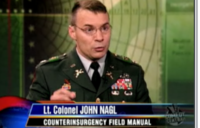 LTC John Nagl, author of How to Eat Soup With a Knife appears on “The Daily Show” with Jon Stewart explaining Counterinsurgency doctrine. Stewart’s reaction to “Be polite – Be professional – Be prepared to Kill” is priceless.