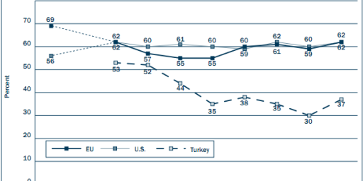 NATO is still seen as essential by 62 percent of both EU and U.S. respondents, demonstrating that the transatlantic military bond is still, despite a rough decade, firmly entrenched in American and European views of the world.