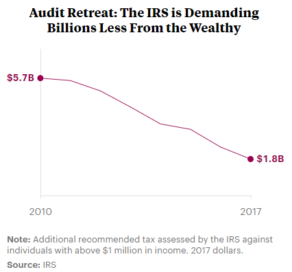 The IRS didn’t even have the resources to pursue millionaires who had been hit with a hefty tax bill and simply stiffed Uncle Sam. It “appeared to no longer emphasize the collection of delinquent accounts of global high wealth taxpayers,” a 2017 inspector general report said.