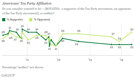 The drop in support for the Tea Party among Republicans is mainly responsible for the drop in support among all Americans since November 2010, from 32% to today’s 22%. Support has fluctuated in the intervening time period, but has been remarkably steady at 22% in the last three Gallup polls conducted since September of 2013. The percentage of Americans who classify themselves as Tea Party opponents, however, has risen to 30%, tied with two measurements in 2010 as the highest in the history of tracking this question.