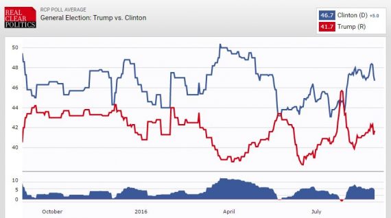 Looking first at the national polls, we see that Hillary Clinton continues to lead Donald Trump quite comfortably, although there has been some tightening since last week. In a two way race, RealClearPolitics shows Clinton with at 46.7% to Trump’s 41.7%, giving her a five point lead in the poll average. That constitutes a drop of one-half a point since last week and reflects the fact that we’ve seen Clinton’s lead in the national polling that has been released over the past week narrow somewhat, although not in what could fairly be called to a statistically significant degree. The change is even smaller in the four-way race that features both Libertarian Party nominee Gary Johnson and Green Party nominee Jill Stein. In that race, Clinton is averaging 42, 2% to Donald Trump’s 38.0%, which is slightly higher than they stood last week, while Johnson has slipped down to an 7.8% average and Stein to an average of 3.2%. This gives Clinton an average lead in a four-way race of 4.3 points. The situation is roughly the same in the Pollster two-way and three-way polls. In other words, there’s been very little significant movement in the national polls, as this chart of the two-way race shows us: