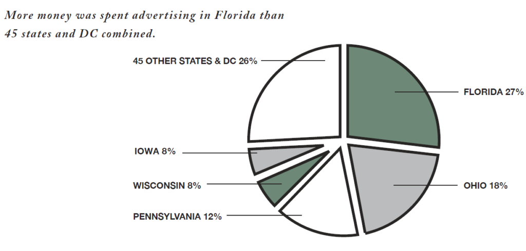 27% of all money spent on TV advertising went to Florida, as did 20% of all candidate visits. A quarter of all resources expended to influence the 2004 election thus were heaped on the 6% of the US population that lives in Florida.