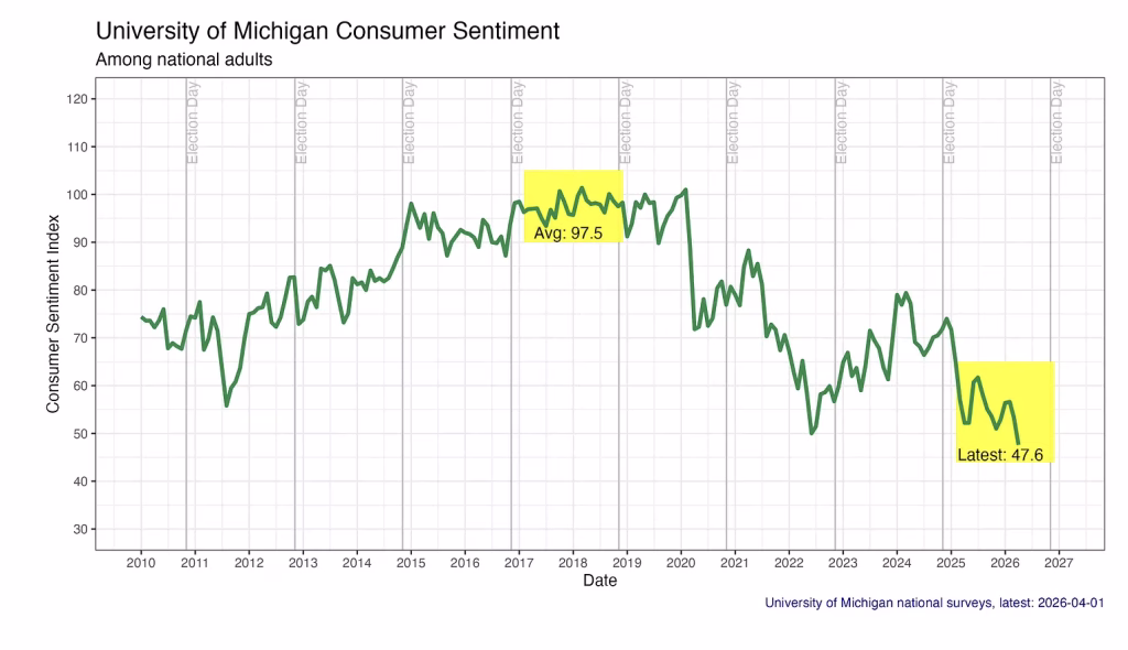 On April 10, the Michigan survey reported consumer sentiment at 47.6, a record low in polling dating back to 1952. Four of the 5 lowest values ever have come in the last 4 years, with two in the Biden administration in June and July 2022 at 50.0 and 51.5 respectively (at the peak of the inflation surge), and in November 2025 with an index at 51.0, in addition to the current all time low. The 5th lowest index ever was 51.7 in May 1980. In short, despite objective measures of GDP, unemployment and inflation having been far worse in some earlier years, Americans are stunningly sour on the economy,
