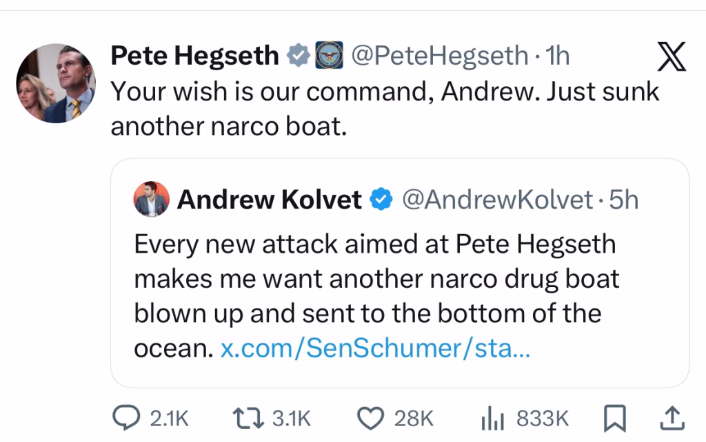 At any rate, blowing up a few boats is not going to achieve much of anything in the grand scheme of things. This fact makes the situation all the worse, because, as I noted in the previous post, we are engaged in illegality, damaging our reputation, and asking US service members to engage in immoral acts so that Pete Hegseth can toss around words like “lethality” and “kinetic strikes” and feel like a tough guy on social media.