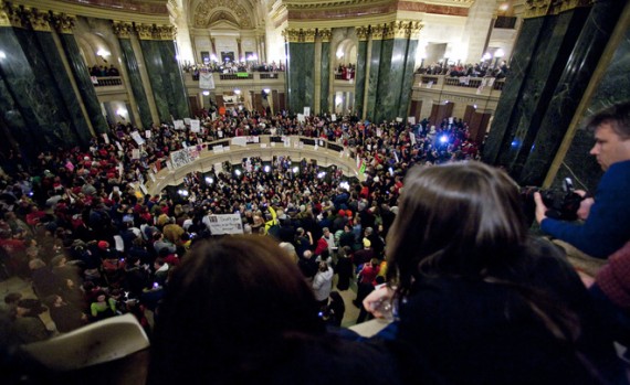 It’s worth noting that this legislation has been handled by the Republicans, at every stage, in a way most likely to inflame the Democratic base here in Wisconsin. The fact that Walker tried to effectively eliminate collective bargaining in a budget repair bill is one; obviously what happened last night was an admission that it was not “budget repair” at all. The way the legislation passed the House originally was truly shocking; basically the Speaker unilaterally shut down debate while house members were still waiting in line to speak, opened the electronic voting system for 15 seconds, declared victory and adjourned the meeting before even all the Republicans had voted.