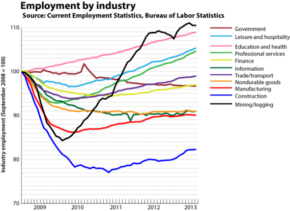 On that note, this chart from Wonkblog provides an interesting look at how various industries have fared both during the Recession, and after it ended: