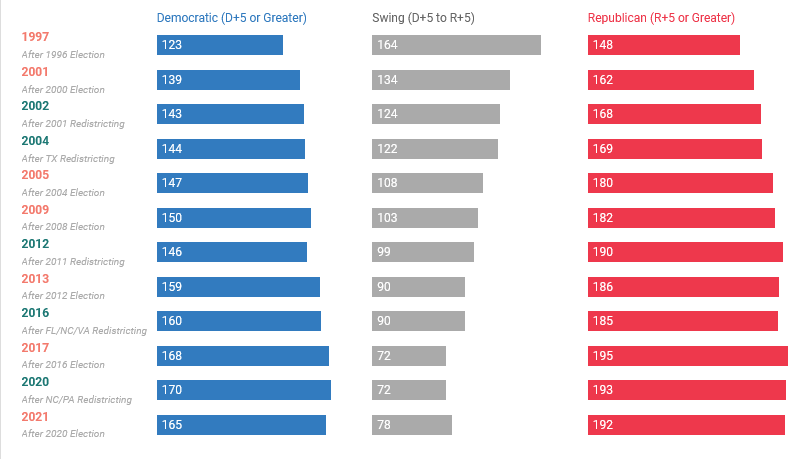 We see here first that the number of House seats that are truly competitive is quite small (even if there was a slight rebound in the 2021 report of +5). Most of the seats in the US House of Representatives are settled in the primaries, not during the general election. This illustrated how little things like national popular opinion matter for political outcomes. To get re-elected to the House in most districts means appealing to the primary electorate, which is but a small slice of the citizenry. This is not a good way to generate representative Representatives (not that single-seat districts can ever do that anyway).