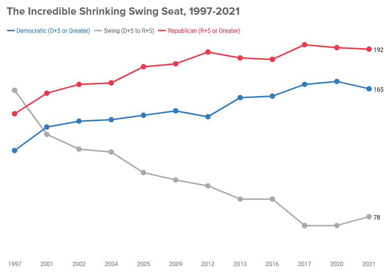 That trend line for swing seats should chill the blood of any fan of a government responsive to the consent of the governed. Sadly, since this represents the current conditions, the governed will have next to nothing to say about improving the trend. Our governmental dysfunction is self-perpetuating.
