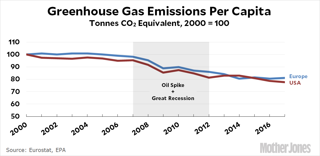 I want to acknowledge that for all the infighting in liberal circles, the real problem is that full-scale climate denialism has taken over the Republican Party. This is what’s keeping us from making serious inroads into carbon emissions. In Europe, by contrast, there is no equivalent to the Republican Party. Nobody denies that climate change is real, and there’s no monolithic political opposition to doing something about it. As a result, over the past two decades Europe has been far more successful at reducing carbon emissions than the United States: