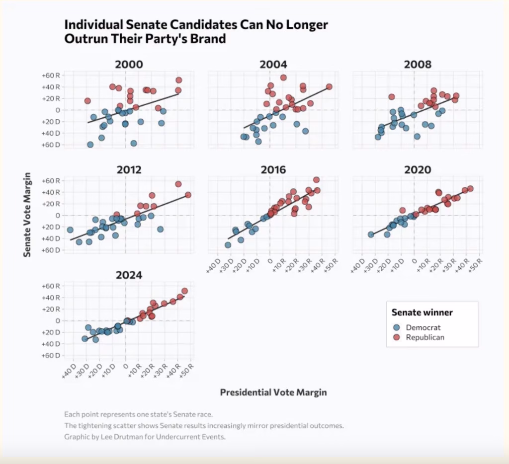 Fast forward to 2024: the R-squared reached 0.90, meaning presidential vote share now explained 90 percent of the variance in Senate vote share. Less than 10 percent of the variance remained for the candidate effect or state-specific factors. Fewer states remained legitimately competitive.