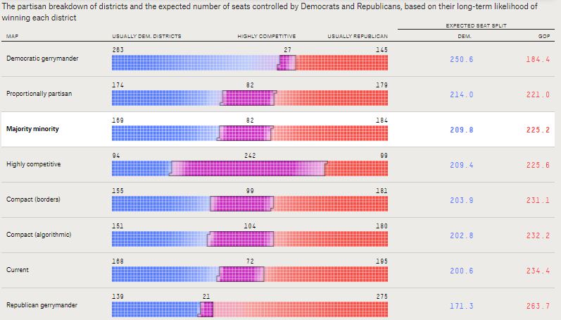 The gang at FiveThirtyEight have undertaken The Gerrymandering Project since January 2018. The simple premise: we can all agree that having politicians draw Congressional districts to maximize their party’s chances of winning is suboptimal but not on what precise alternative is best. So, they show us eight possible outcomes using eight prioritization models: