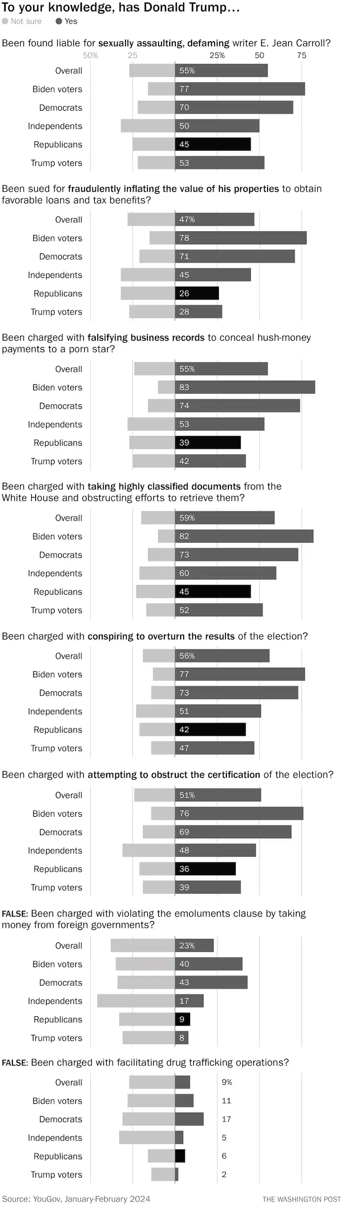 The other six were real. The one that was familiar to the most people was the federal classified-documents case that is moving forward in Florida; 6 in 10 Americans said they were aware of that case. The one that had the least awareness was the civil suit in New York in which a judge determined that he’d fraudulently inflated the value of his assets. Just under 50 percent of Americans knew about that.