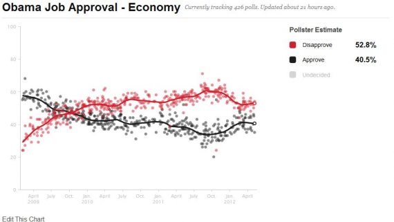Obama’s disapproval on the economy is at 53%…but if you look at the “Related Posts” section it has a link to another post Doug did in September of ’11 that had Obama’s disapproval on the economy at 62%. Now in this post Doug is arguing Obama’s situation could get worse. But in reality it has been getting better. So this post should really be that Obama has had a 9-10% swing to the good in the last 6-7 months.