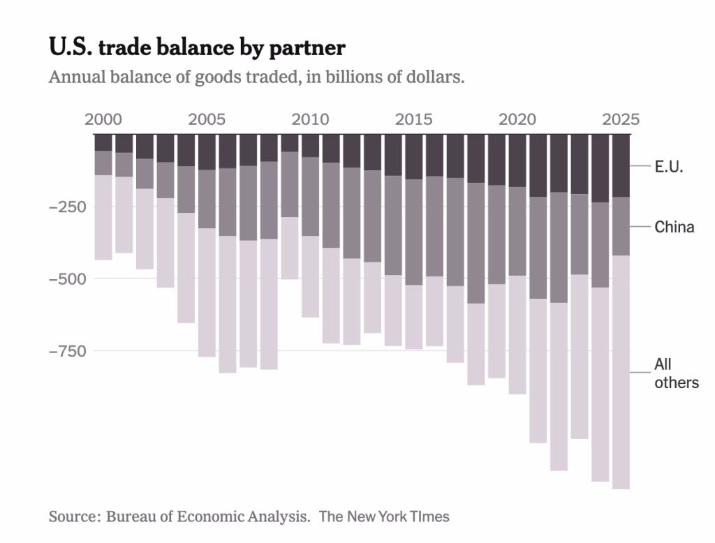 Inflation, which Mr. Trump promised to end “on day one,” picked up in 2025. The trade deficit in goods, which Mr. Trump promised to shrink, hit a record high. The manufacturing sector, which Mr. Trump promised to restore, shed jobs.