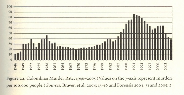 A couple of things to note in this graph. First, the spike in the 1940s and 1950s was La Violencia noted above. The upward trend from the mid-1970s that peaked in the early 1990s was driven heavily by the drug war (and especially the conflict between Pablo Escobar and the Colombian state). Drug violence and growth in right-wing paramilitaries (which really start to be a major player in 1980s) help maintain the violence once Escobar was gone (he was killed in 1993), as well as fuel the spike in the early 2000s. Colombia violence, it should be noted, is a complex mix of guerrillas, cartels, paramilitary groups, and the state. It is also worth noting that those categories are not always mutually exclusive.