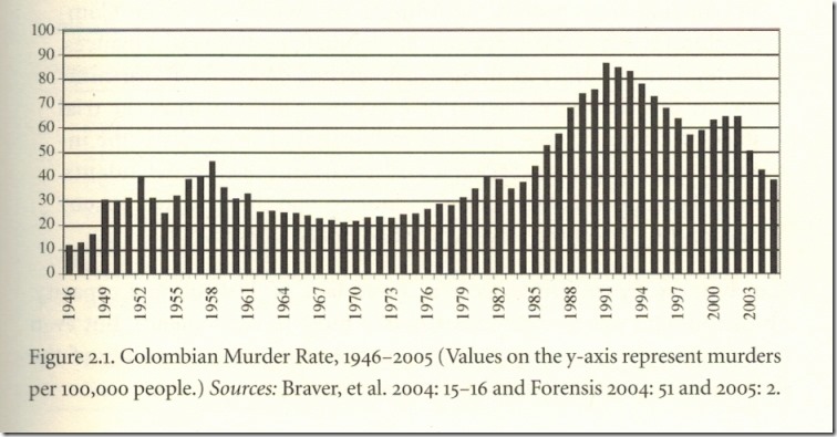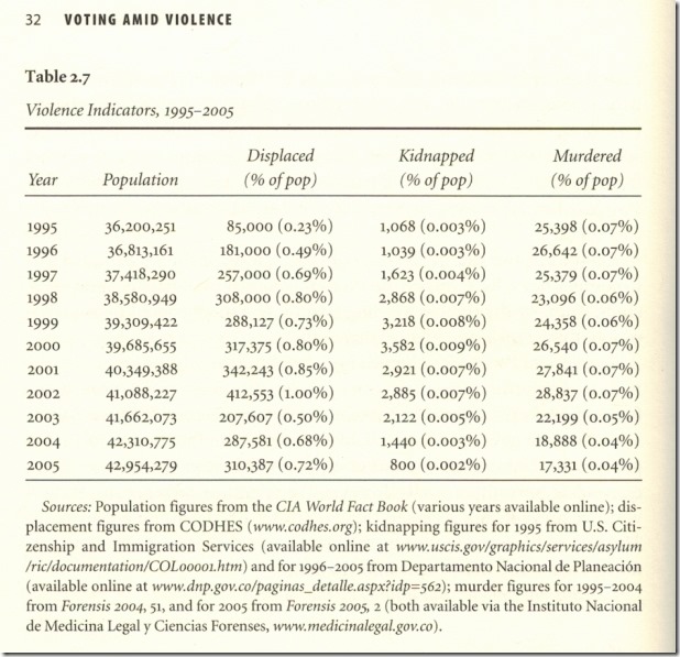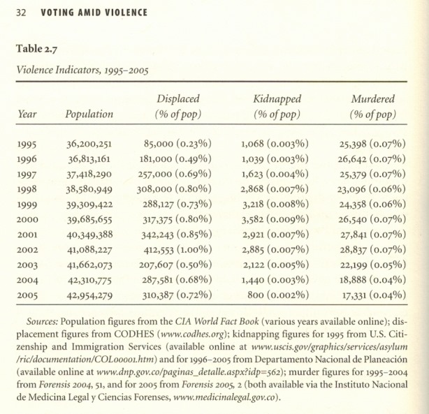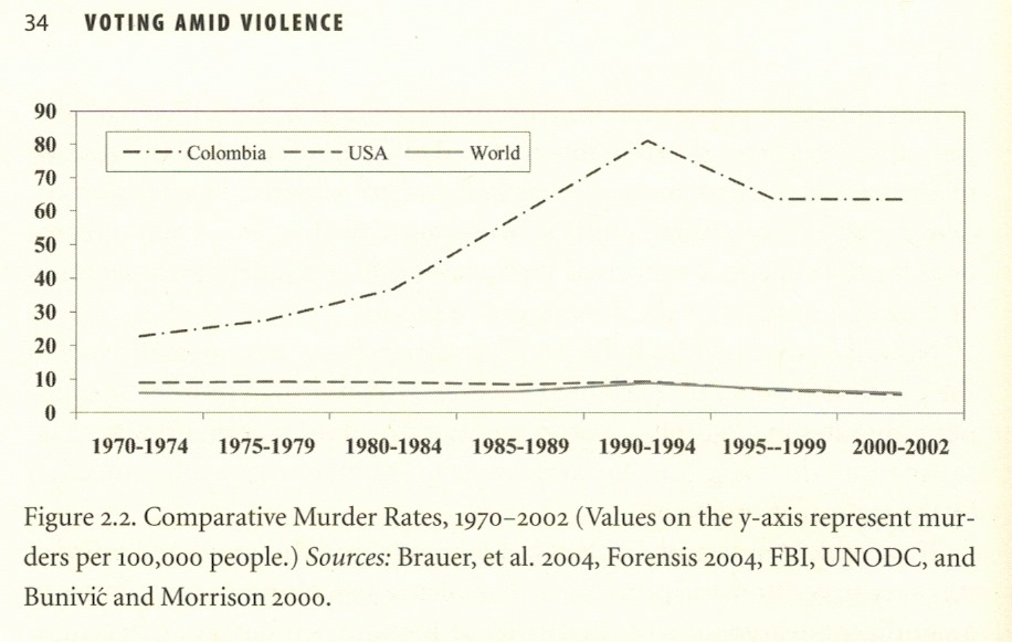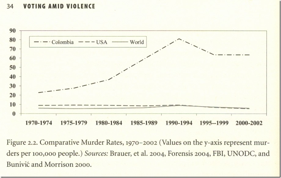 The 1990s and the early 2000s were especially violent and difficulty times in Colombia. Here are some charts from my book, Voting Amid Violence: Electoral Democracy in Colombia that underscore the situation: