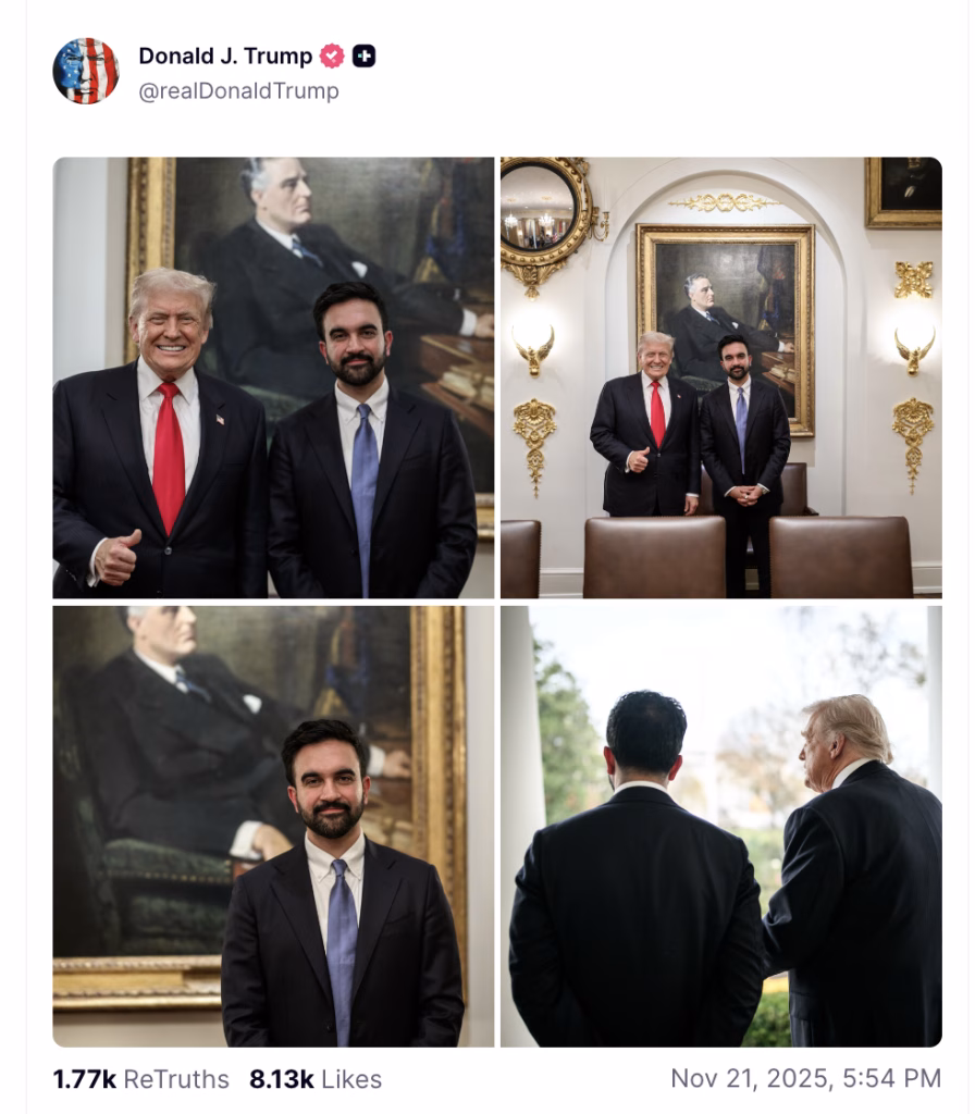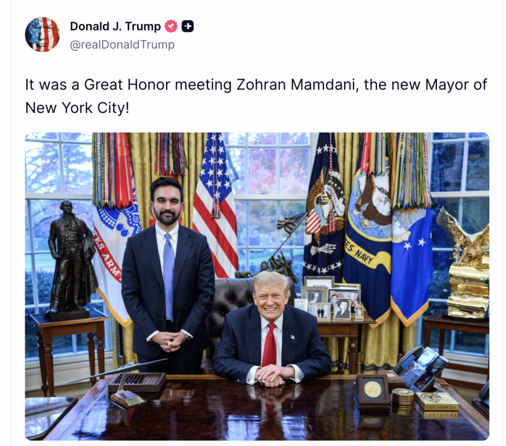 Let’s talk about two stories from yesterday. First, via CNBC: Trump praises NYC Mayor-elect Mamdani after White House meeting, shrugs off being called ‘fascist’.