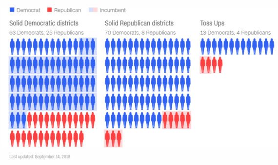Democratic female incumbents began their elections in a strong position. Currently, 52 of the 54 Democratic incumbents who won their primaries are running in Solid Democratic districts. The other two are in Likely Democratic districts. Still, there are slightly more Democratic women running in Solid Republican districts than in Solid Democratic districts.