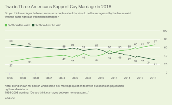 A new Gallup poll finds that two-thirds of Americans support same-sex marriage: