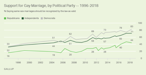 Of course, it’s worth noting that support for marriage equality still varies based on political party, with Republicans still lagging behind Democrats and Independents in their support for something as seemingly simple as marriage equality: