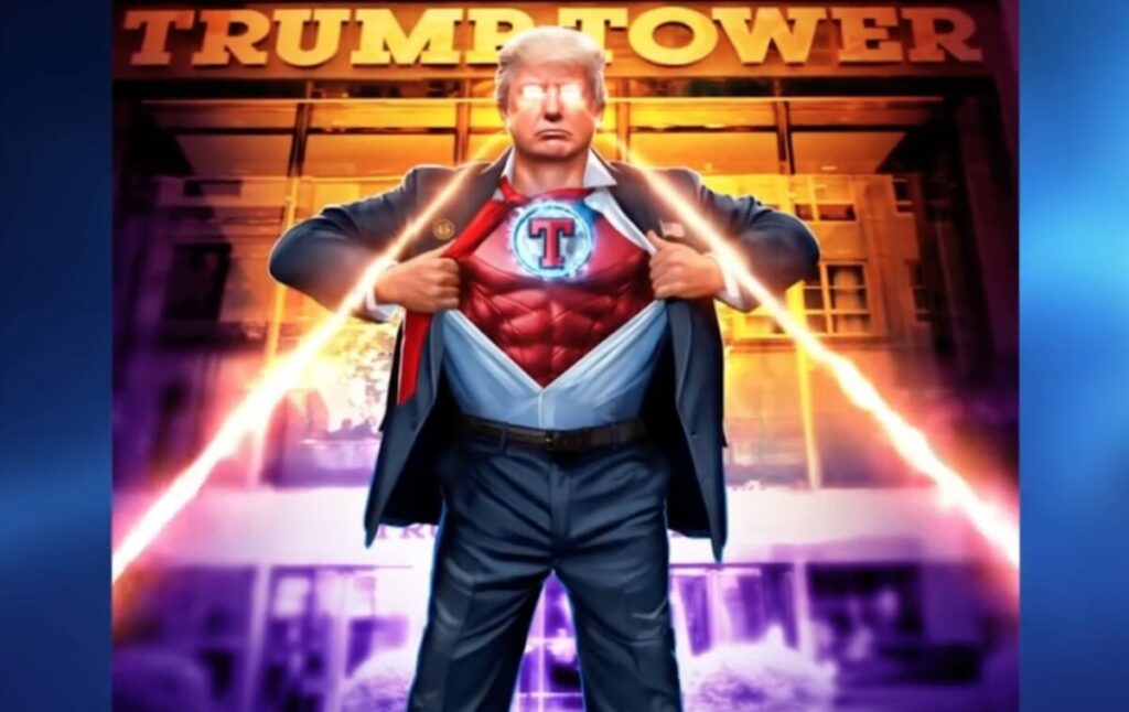 A promotional graphic showed a deeply muscular and toned Trump donning a red outfit laced with the number 45, a nod to his presidency, with a stoic look on his face and an American flag-styled cape draped behind him.
