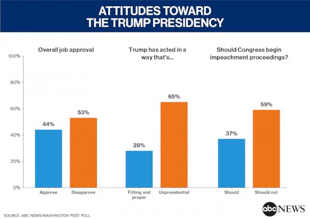 Personally, moreover, a broad 65% say that since taking office Trump “has acted in a way that’s unpresidential,” not far from the 70% who said so in mid-2017 and early 2018 alike. Just 28% in this poll, produced for ABC by Langer Research Associates, say his behavior is “fitting and proper” for a president.