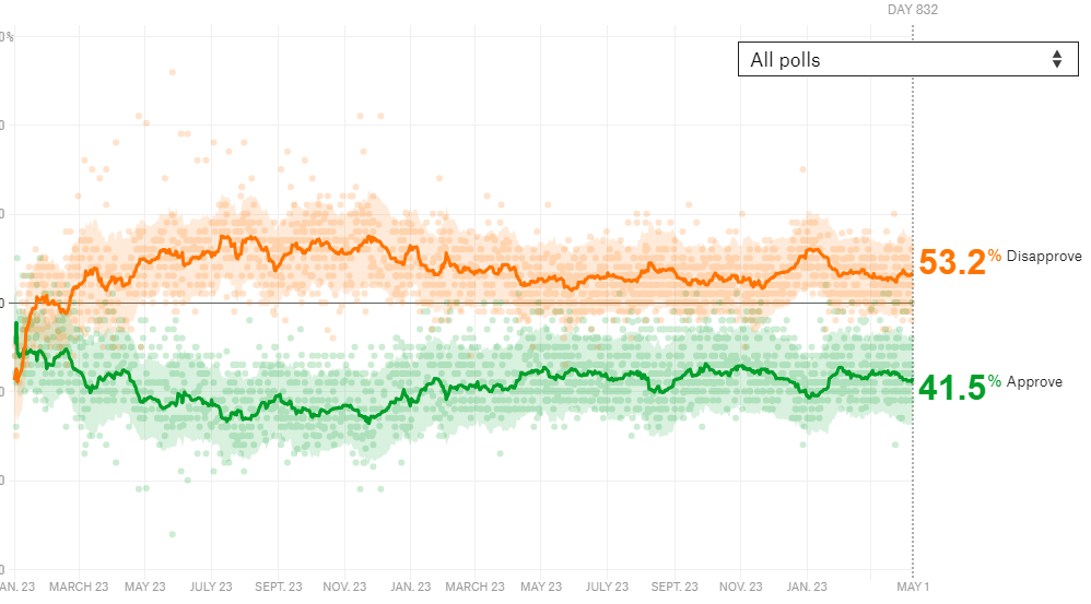- The latest Reuters/Ipsos poll shows the President’s approval at 40% and his disapproval at 53%;