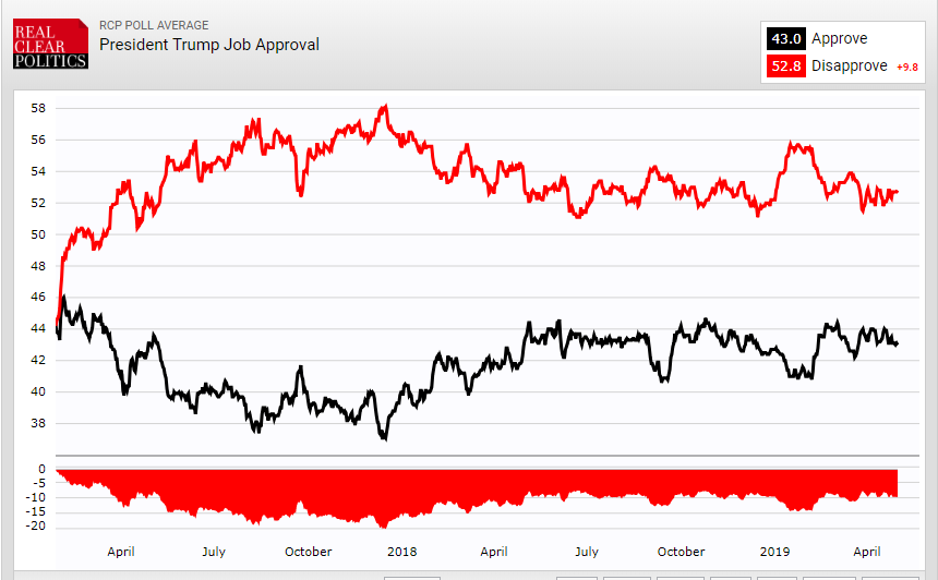 I believe that’s largely true, but every now and then his approval experiences temporary dips. Last week a Reuters/Ipsos poll was released showing it at 37%, the lowest all year (including during the government shutdown), and some liberal blogs began crowing about how the Mueller report was finally taking a toll on his popularity. But now on the same pollster he seems to have returned to a lofty 40%. Maybe that was just statistical noise, but there have definitely been times (including during this year’s shutdown) where his approval went down only to bounce back as soon as the event in question passed. This is the “I don’t like what’s happening now, but I’m ok with Trump in general” bloc.