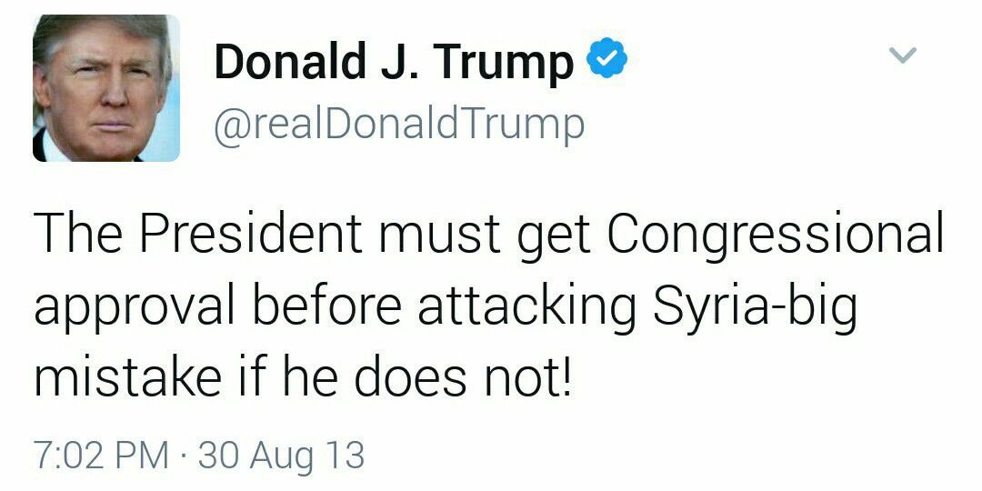 @Gavrilo: What was Trump supposed to do? Do people have no memory at all? Trump did not support going after Assad. Ever. At any time. He did not even have a problem with Saddam gassing the Kurds. It is not as if he has spent years demanding that we stop that evil man and set those people free. He was one of the people demanding we do NOTHING for years.