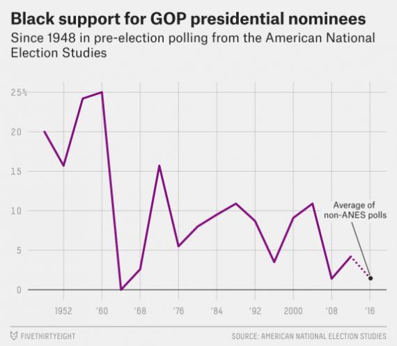 Since 1948, the average Republican nominee earned about 10 percent of the black vote. Even since the passage of the 1964 Civil Rights Act, when black voters began moving into the Democratic Party, the average Republican nominee got an average of about 7 percent. Trump is pulling in about one-fifth of that.2