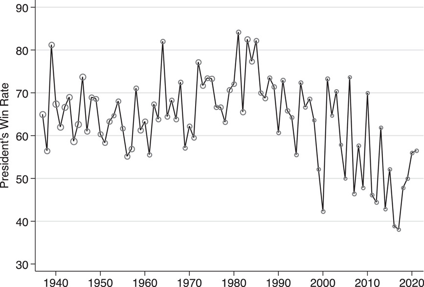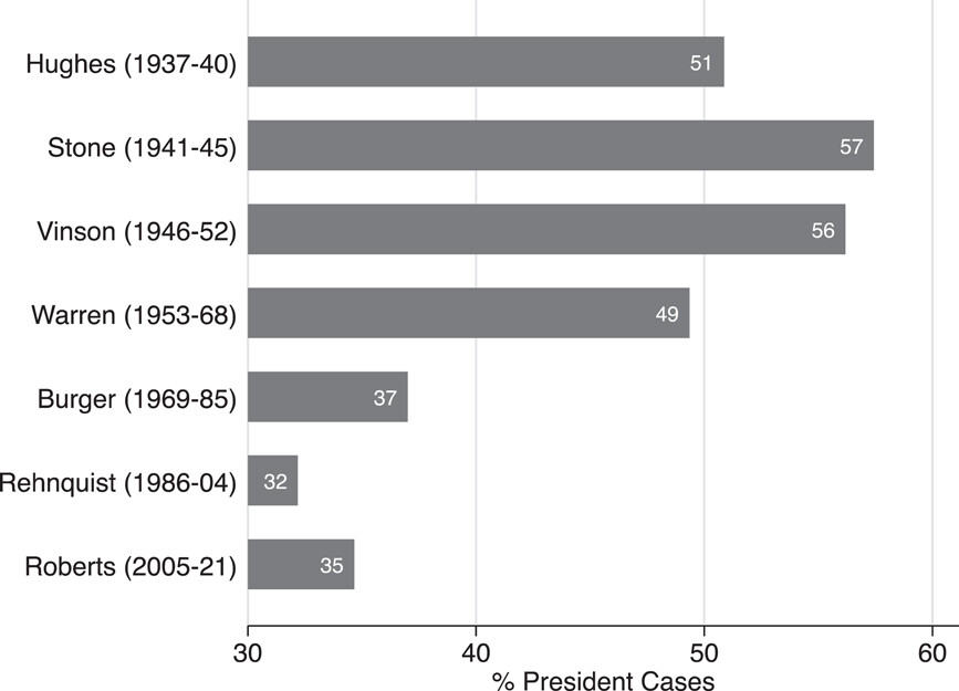 Our systematic analysis of voting data and doctrine since the 1937 term suggests that the Court has often served as a reliable backstop. Although it tends to hold for the president across all cases (a 65% win rate), in highly important disputes implicating executive authority, the justices are far less deferential. In these weighty cases, the Roberts Court (2005–2021 terms) was especially tough on the president, ruling in his favor in only 35% of them.