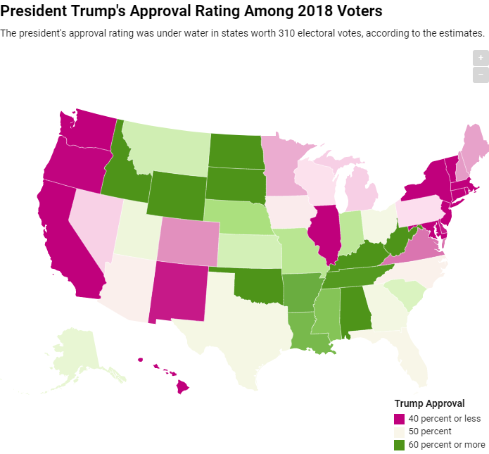 The best available evidence on the president’s standing by state comes from the large 2018 election surveys. Their quality is generally high, and unlike most surveys, they have been adjusted to match actual election results, ironing out many potential biases of pre-election polls. Although these surveys are nearly nine months old, the stability of the president’s overall approval ratings means, for our purposes, that they remain a decent measure of the distribution of his support.