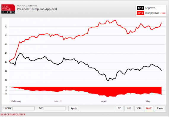 All of these numbers are from surveys taken within the past two weeks or so and include a sufficient amount of time for things such as the vote on the American Health Care Act last week and the testimony of former F.B.I. Director James Comey regarding an investigation of the Trump campaign’s ties to Russia. Obviously, yesterday’s news regarding Comey’s firing will have some impact on the numbers as well but it will be at least a week before we know for sure what that impact might be. In any case, these numbers are quite obviously not good news for the Administration. As I’ve said before, historically it’s been the case that an incoming President enjoys at least some kind of a honeymoon period during which the public gives him the benefit of the doubt and has a generally positive view of his performance on the job. How long that lasts has varied from President to President, of course, and depends many times on factors outside of a President’s control. President Obama’s job approval, for example, stayed positive for roughly a year and a half before it started to turn negative headed into the 2010 midterm elections. President Bush’s job approval, on the other hand, remained positive for the majority of his first term thanks in no small part to the September 11th attacks and the extent to which the country rallied behind him in the wake of those attacks. Trump is getting no such honeymoon, and the current trend indicates that things are only likely to get worse as we head deeper into his first year in office. This could have important national implications for the 2018 midterms, and the interesting question will be whether Republicans running for re-election in battleground districts and states end up deciding to distance themselves from the President in order to save themselves. If that happens, it could have big implications both for the fate of Trump’s agenda on issues such as tax reform, the budget, immigration reform, and other issues as well as for the support for an investigation or independent counsel in connection with the allegations regarding Russian interference in the election and the Trump campaign’s ties to Russia. Of course, by that time it may be too late for them.