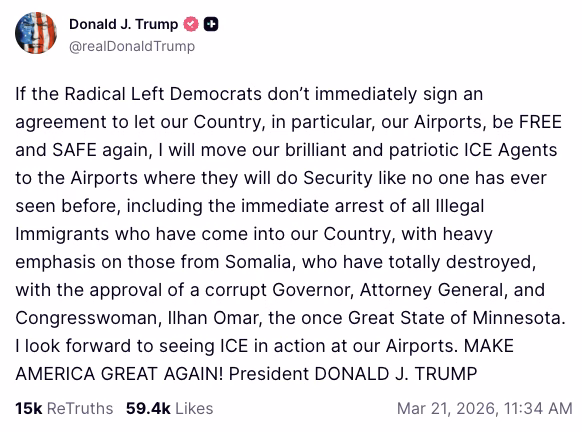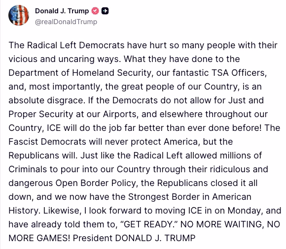 If a deal isn’t reached, Trump wrote Saturday in a social-media post, “I look forward to moving ICE in on Monday.” ICE agents at airports would do “Security like no one has ever seen before, including the immediate arrest of all Illegal Immigrants who have come into our Country,” he wrote in another post.