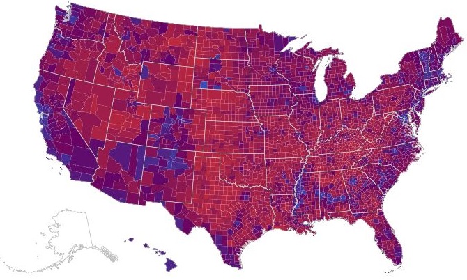 The fact that most of the country is purple emphasizes the impossibility of secession and a second Civil War, an idea avidly promoted by a lot of Trumpkins. As I’ve said many times before, who are you going to shoot? Your next door neighbor?