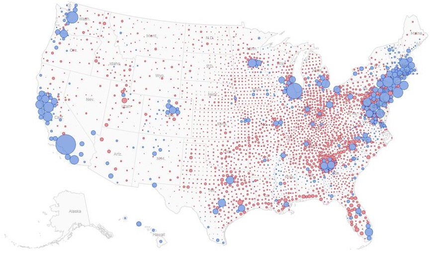 Even that map, though, doesn’t tell the whole story because counties vary wildly in population. This second visualization from the same source demonstrates just how starkly: