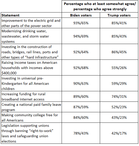 — Majorities of Trump and Biden voters express support for several elements of the bipartisan infrastructure and reconciliation bills being debated in Congress, but there are marked differences in their levels of support. (see Table 1 below)