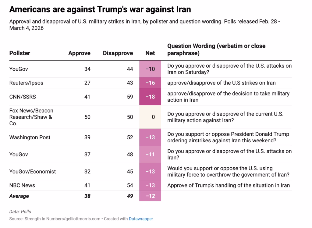 The big takeaway from these numbers is that the new war in Iran is very unpopular. Not merely negative-number-so-what unpopular, but worst-ever-support-for-war-when-it-started unpopular. With just 38% of Americans in favor, support for bombing Iran is lower than retrospective support for the war in Iraq was in 2014.
