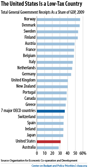 But I wonder what, exactly, this is comparing. The chart is on a Flickr page and I couldn’t find any methodology for it on the CBPP’s website. It’s also on their blog, along with some other charts, but without any explanation on how it was compiled aside from the notation that it’s based on OECD data. Off the top of my head: Do these figures include state and local collections, or just those of the central government? Social Security and Medicare collections?