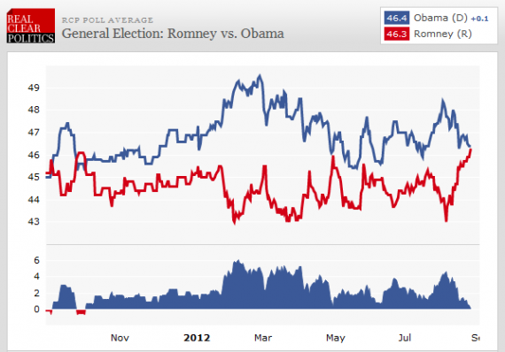 There is some good news in the early post-convention polling for Mitt Romney, though. There seems to be at least some indication that his likability numbers are improving, which is in some ways more essential than what happens to the top line numbers in a national poll. If that continues to replicate itself in the polls that will come out later this week, then it could potentially help Romney overcome some of his inability to break through in some of the battleground states. Also likely making the folks in Boston happy is the fact that the national polls have been showing a closer rater of late, with Romney risking and the President falling ever so slightly. You can see that phenomenon in the latest RealClearPolitics chart, where the average for the national polls gives Obama an ever-so-slim +0.1 advantage: