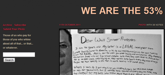 The overriding message is that the protesters have failed to take personal responsibility, blaming their economic troubles on others. “Suck it up you whiners. I am the 53 percent subsidizing you so you can hang out on Wall Street and complain,” writes Erickson, in the Tumblr’s inaugural post. “I don’t blame Wall Street because it doesn’t matter what Wall Street or anyone else does. I am responsible for my own destiny. I will succeed or fail because of me and me ALONE,” writes another contributor, who describes himself as a Marine Corps veteran. Another irate contributor writes: “I take risks so my kids can have a better life. Not so you can sit on your [expletive] at my expense.”