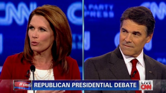 This exchange between Rick Perry and Michele Bachmann at last night’s debate:
