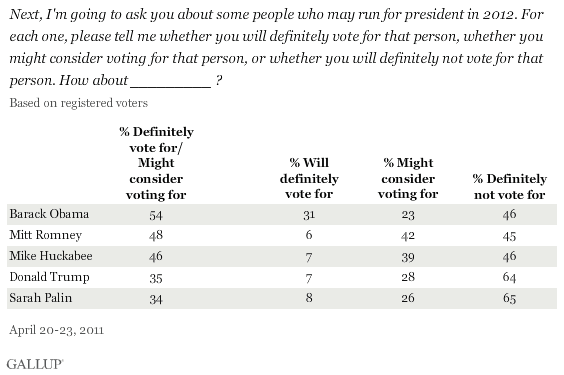 PRINCETON, NJ — More than 6 in 10 registered voters nationwide say they would definitely not vote for Donald Trump or Sarah Palin for president in 2012, significantly more than say the same about possible Republican candidates Mitt Romney or Mike Huckabee, or about President Barack Obama.