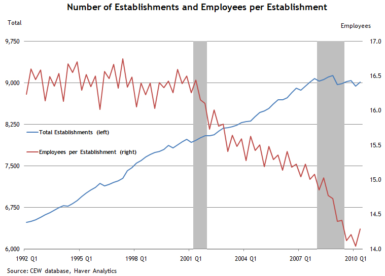 So far, though, the evidence doesn’t seem to be supporting that conclusion. Not only is the financial industry basically intact and back to turning record profits, but it’s business models have barely been tweaked. In the meantime, as the Federal Reserve of Atlanta reports, the past three years have shown no growth in the number of businesses — the trendline has been flat. And that’s happening at a time when the numbers of employees per business has plummeted (except for health care), as you can see on the chart below: