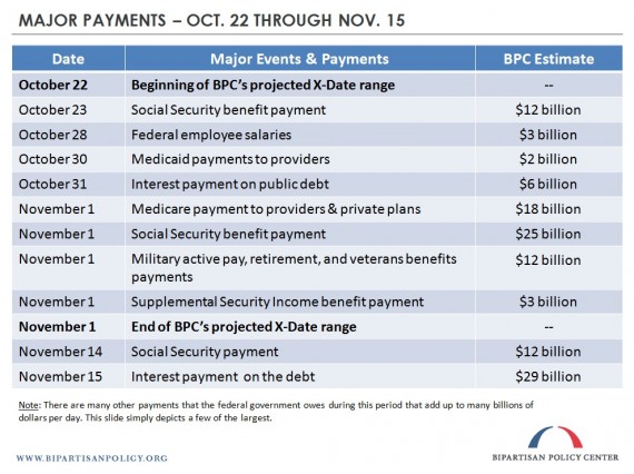 Tomorrow, October 17th, is the date that the media is focusing on in connection with the debt ceiling largely because that is the date that the Treasury Department has stated the United States will officially run out of the authority to borrow money and will have to rely solely on cash-on-hand and cash receipts to finance the bills that will coming due in the ensuing weeks, including everything from financing the National Debt to paying Social Security benefits, salaries, and government contractors. In reality, though, the real question is when the Treasury Department actually might run out of cash, because that won’t necessarily happen on Thursday. One calculation from the BiPartisan Policy Center puts the date somewhere between October 22nd and November 1st: