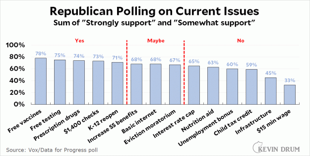 In yesterday afternoon’s post “Here’s What Republicans Do and Don’t Support,” he dug into the data from a new Vox/Data for Progress and produced this graphic: