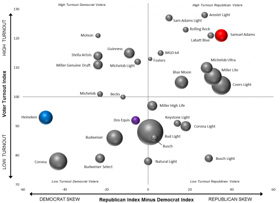 Ironically, this is in contrast to its corporate sister Heineken, which as it turns out is the most Democratic beer of all. On the other hand, Republicans love their Coors Light and favor Sam Adams, which is brewed just a few miles away from Romney campaign headquarters and whose namesake was an original tea partier.