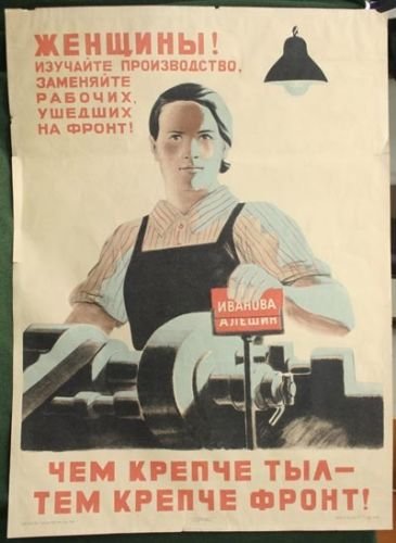 The other poster features a female factory worker. According to this eBay seller, who is offering one for $1,660, the poster was printed on June 26, 1941, days after Russia began fighting the Axis powers in World War II. It encourages women take jobs vacated by men who have gone to fight. The woman in the poster is switching out a tag with a man’s name to one with hers and the text says: “Women! Learn production, replace workers who went to the front! The stronger the hinterland – the stronger the front!”